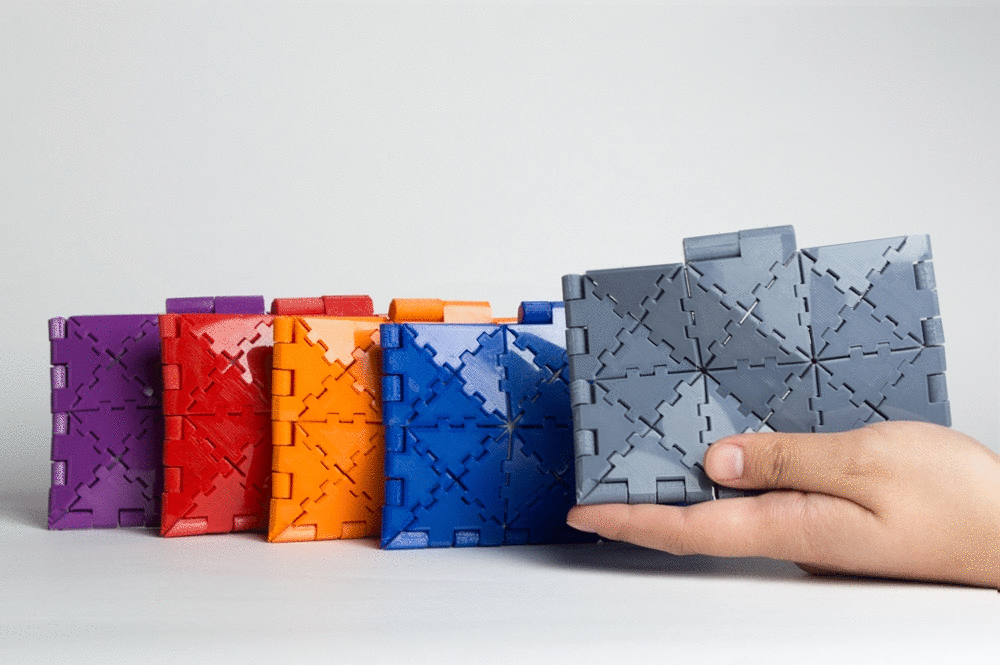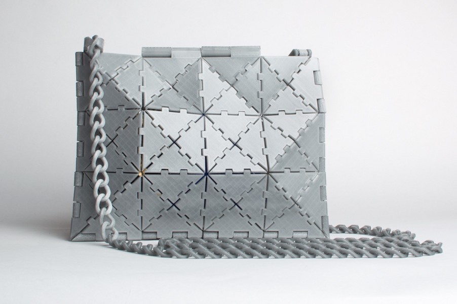 I had to figure out how to make 3D printed plastic flexible and, well, bag-like. The triangles are hinged, so the “fabric” can fold.