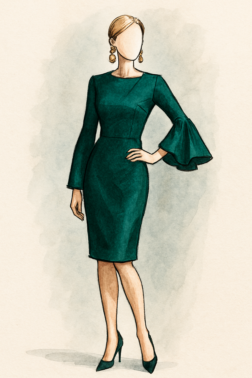 Persona 1 (Marketing Manager): My ideal dress would be something that combines elegance with a touch of modern flair. I envision a knee-length dress with sleek lines and maybe a little bit of asymmetry to keep it interesting. I'd love it in a classic color like midnight blue or emerald green. It should have some kind of standout element like statement bell sleeves or an intricate neckline. And of course, it wouldn't be complete without some sort of bold jewelry worn with it – maybe dangling earrings?