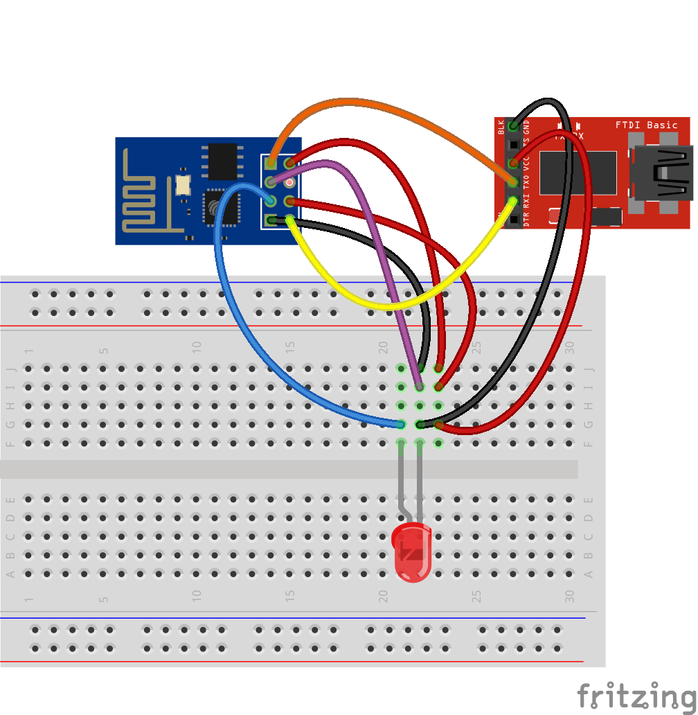 Now that code is written, go ahead and wire things up. To do this I used an FTDI to USB cable. The FTDI cable powers the ESP and connects it to the Serial Terminal. Of course, you can also use FTDI Friend or other FTDI connectors. Here is a diagram of the ESP connected to an LED and an FTDI friend from Sparkfun.