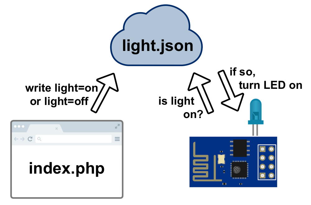 On the client side (the page on my phone), the "Light On" button sends a "On" value to the light.json file. The ESP8266 connects to my home Wifi and reads the light.json file. If it sees an "On" value, it lights up.