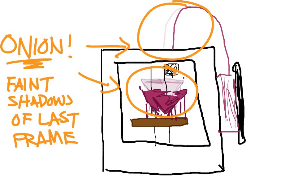 Now, when you start drawing on a new keyframe the old drawing disappears. However, you can turn on the “Onion” skin feature to see a faint shadow of the last keyframe.