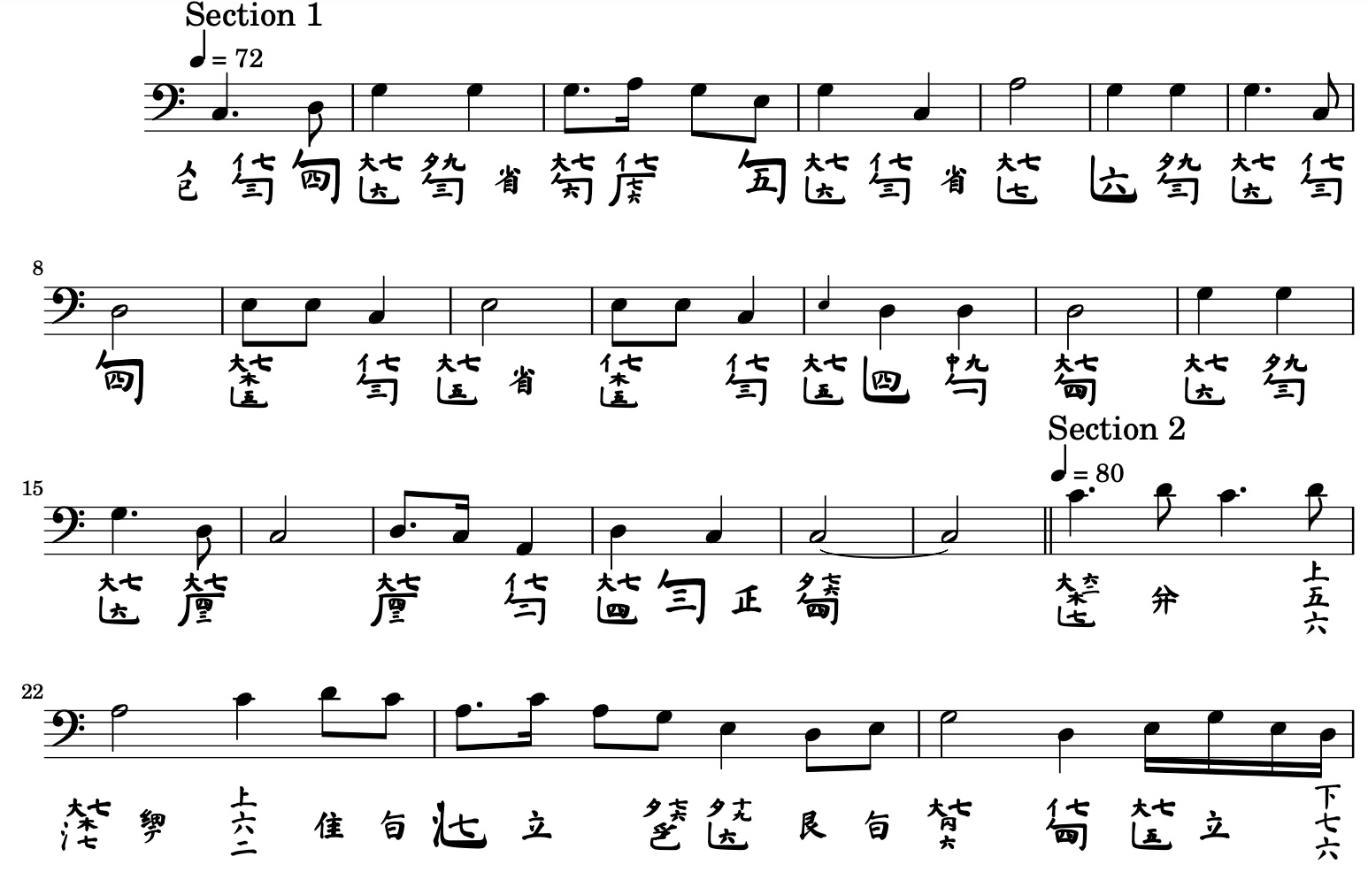The full capabilities (including how to write chords/撮, glissandos/滚沸, and other special characters), please see the documentation on my GitHub page.