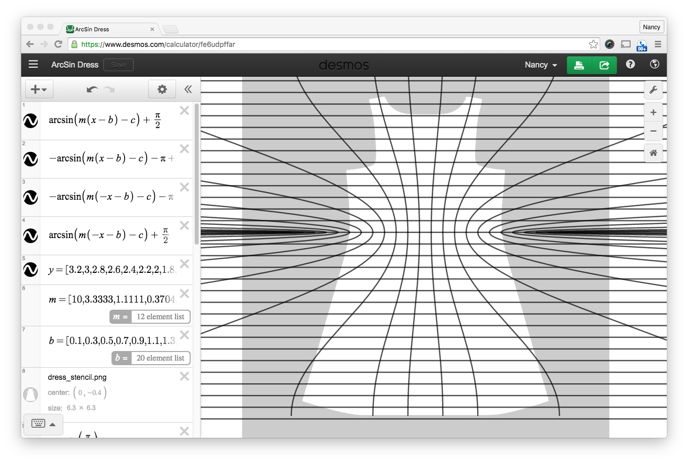 Next, I had to create the "print," the curvy lines on the dress. The curved lines could be represented by ArcSin formula. I used the online graphing calculator Desmos, an online graphing calculator to create the print. Here's a link to my ArcSin formula.