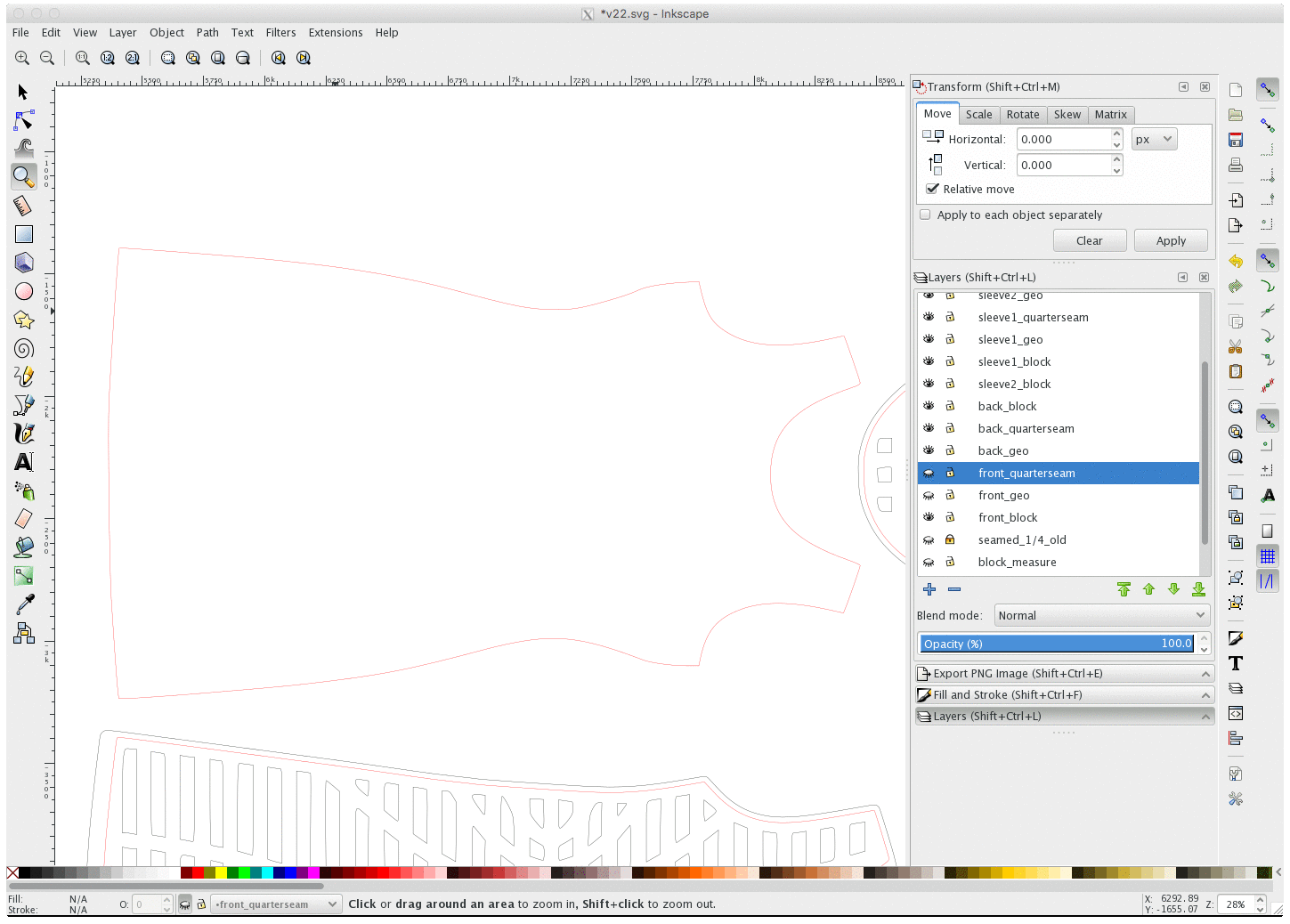 I imported the pattern file into InkScape to generate the vector files needed for laser cutting. I used InkScape to add seam allowance (1/4 inch in this case, 1.5 inches for the hems).