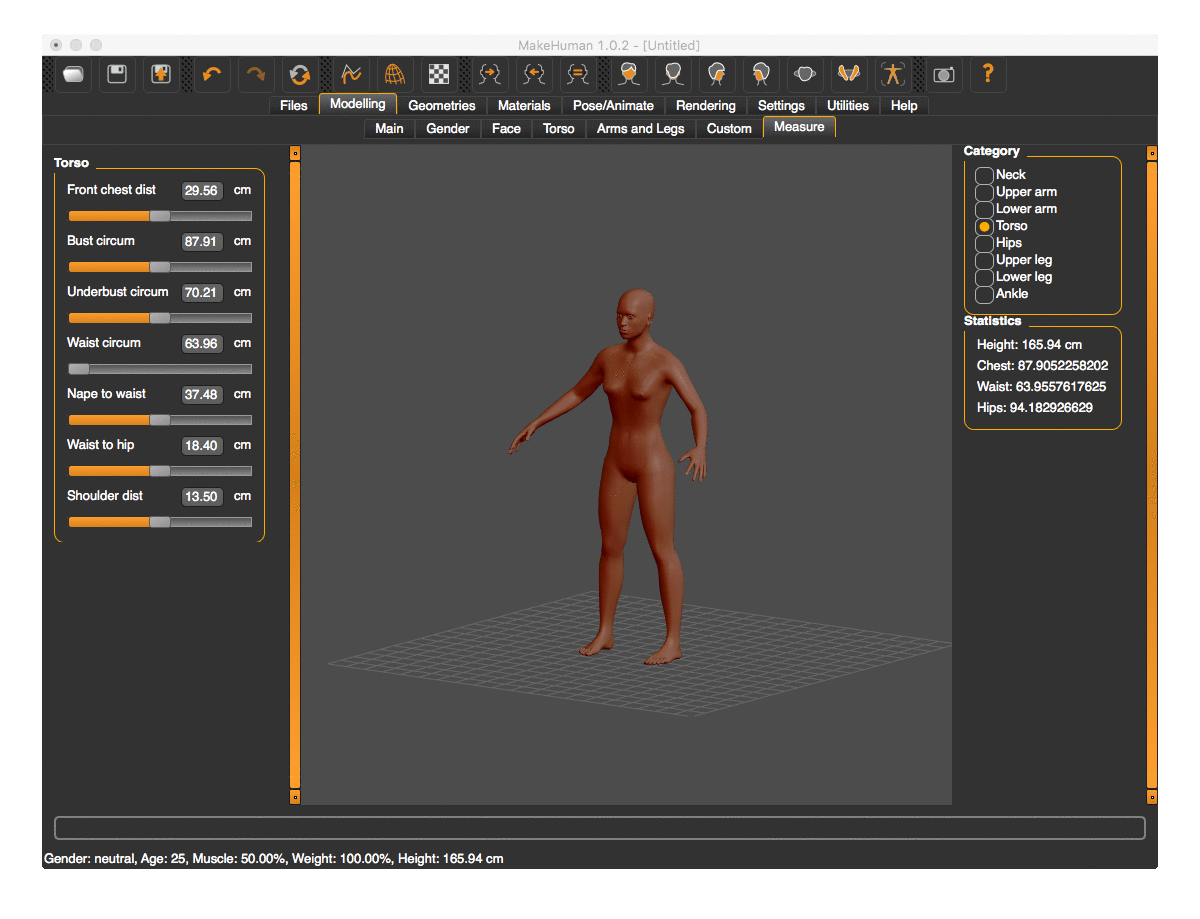 I used Make Human to build a custom virtual model according to my specific dimensions: height, waist, hips, etc. If I'm going to custom make something, might as well make it fit my body. I'm short with a high waist, so the torso is usually problematic and dresses often fall below my knees, which makes me look shorter.